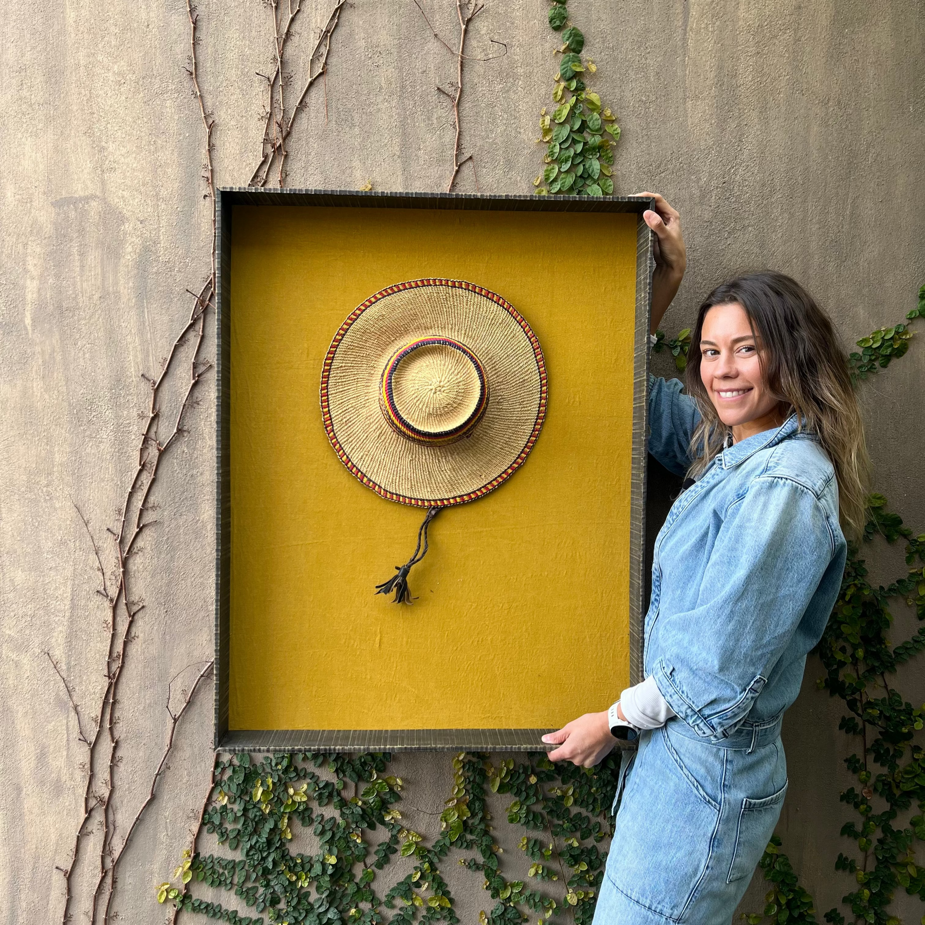 Sombrero africano enmarcado sobre fondo de lino y marco cajón rústico.