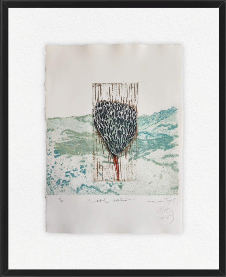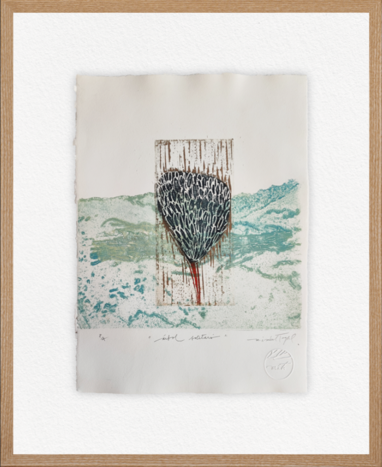 Obras inspiradas en la naturaleza, realizadas sobre papel de algodón con tecnica mixta: Grabado en metal, aguafuente, aguantina y linografía. Artista: Isabel Tagle