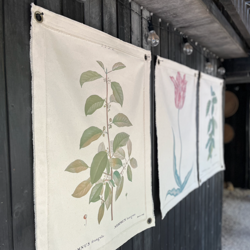 Lona color crudo impresa, bordes desflecados y ojetillos.