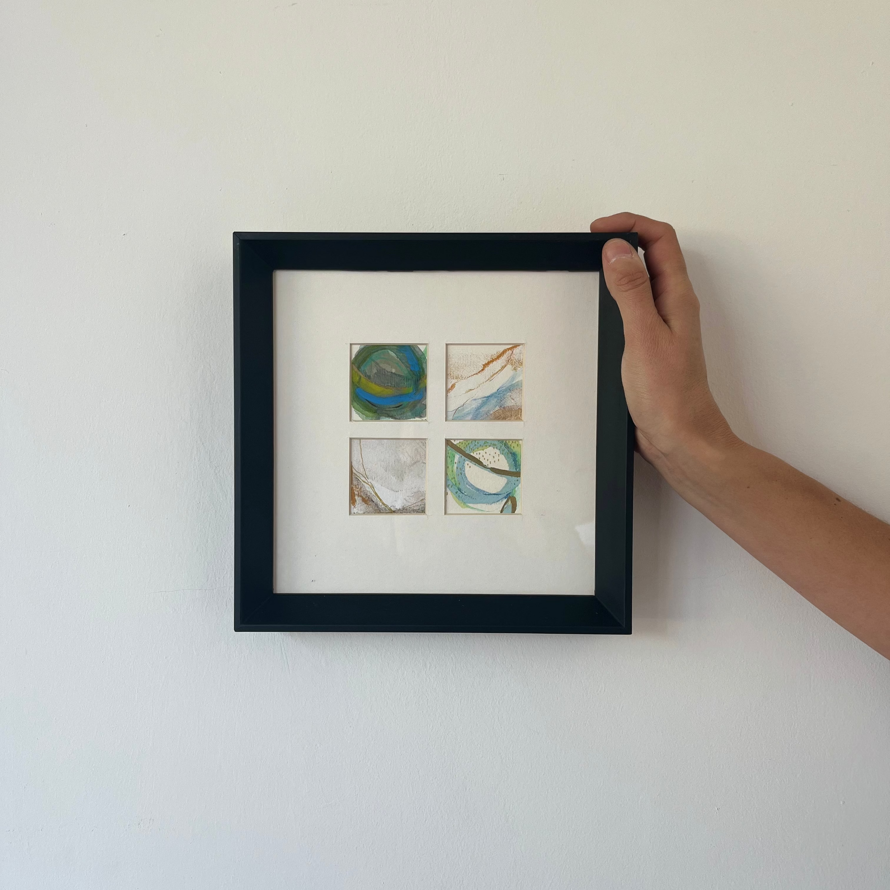 Trabao pintado a mano y elaborado por capas de técnicas mixtas –acuarela, lápices pasteles y grafito– que buscan poner orden y belleza al caos.