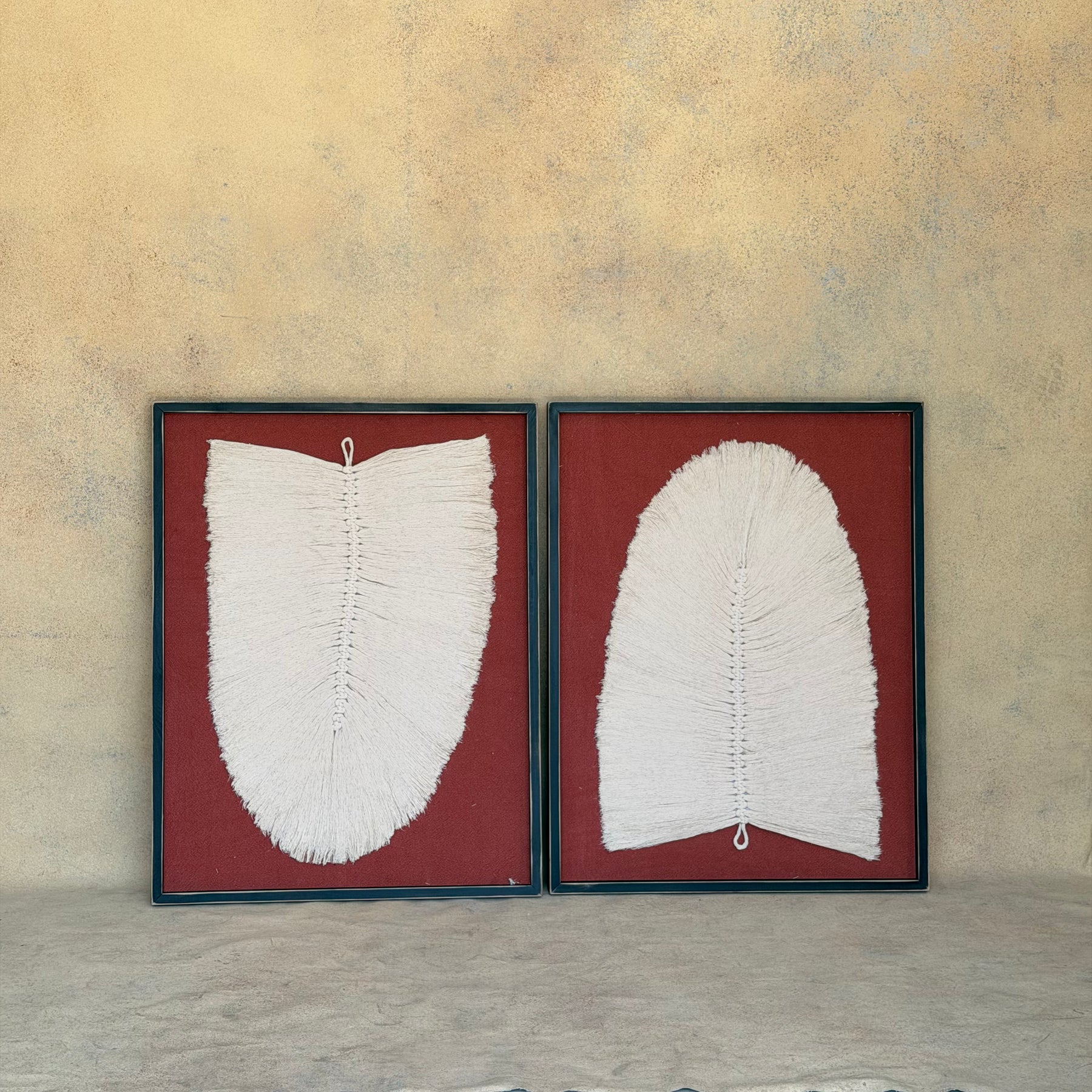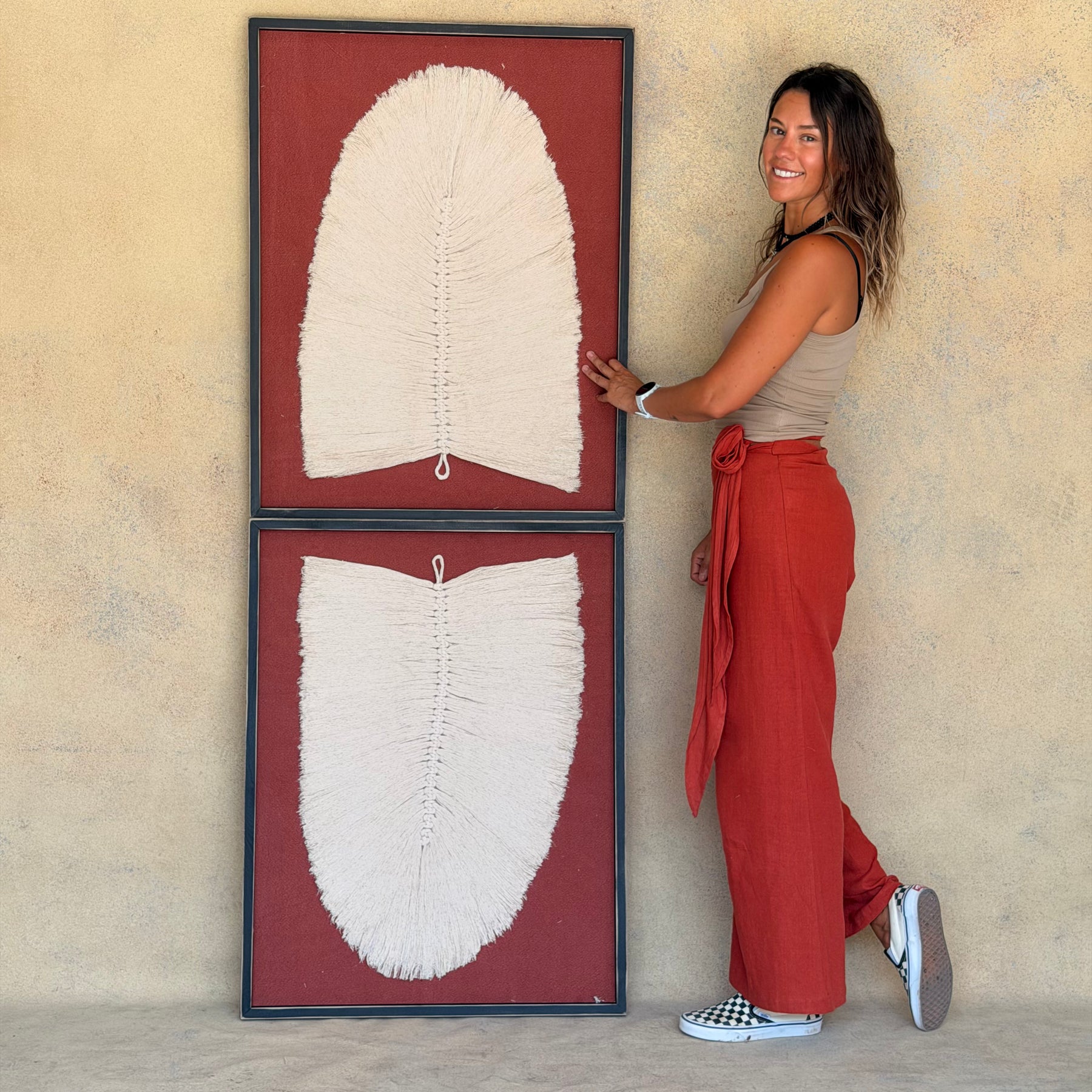 Plumas tejidas artesanalmente en fibra de algodón, dispuestas sobre fondo de lino, marco tipo cajón a elección.