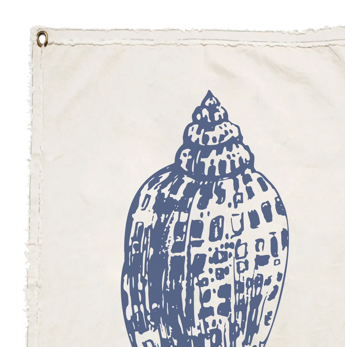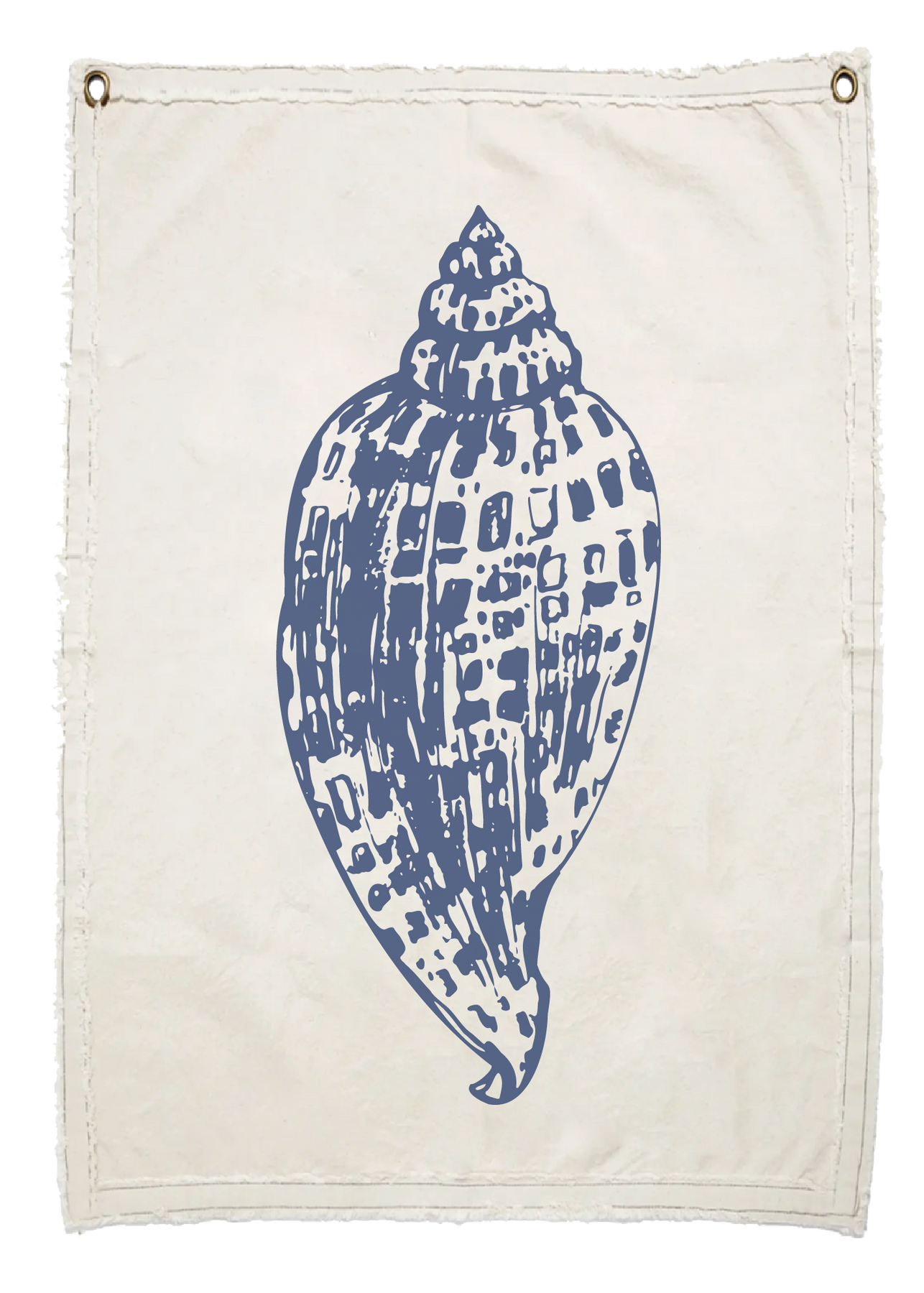 Lona color crudo impresa, bordes desflecados y ojetillos.