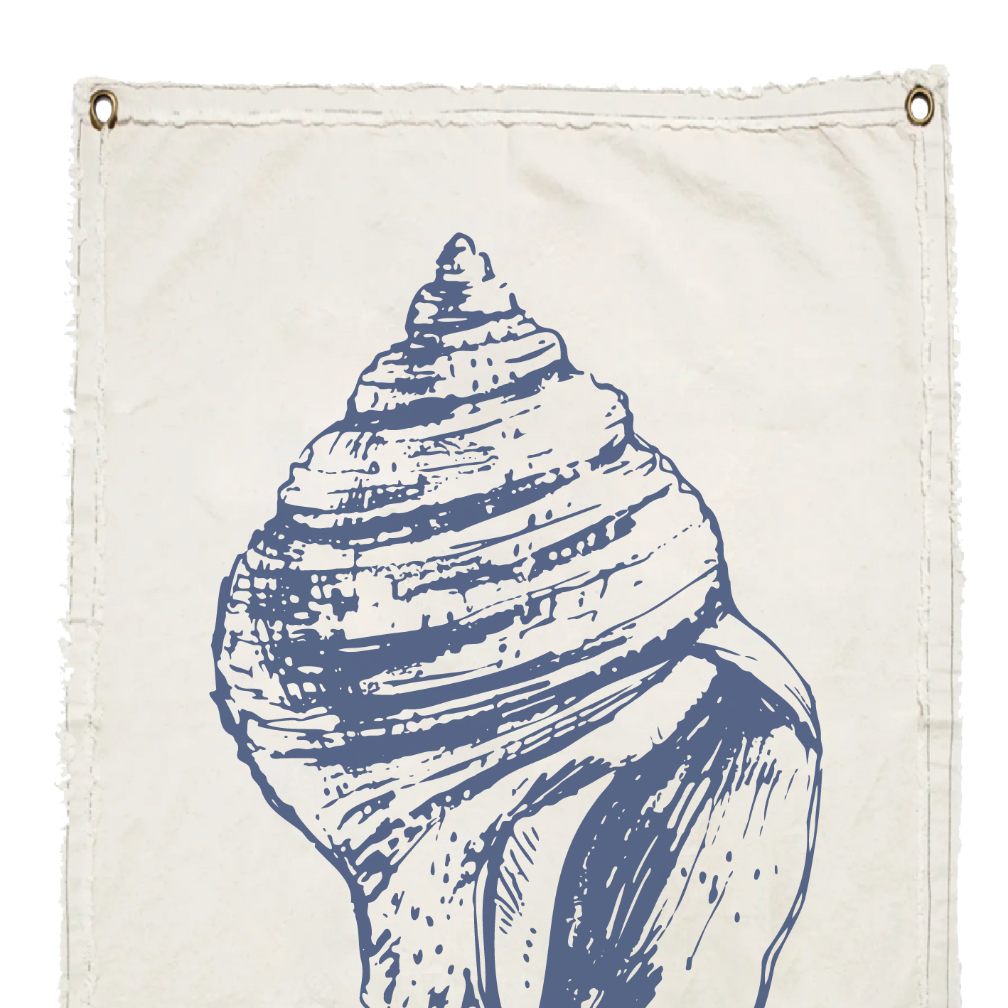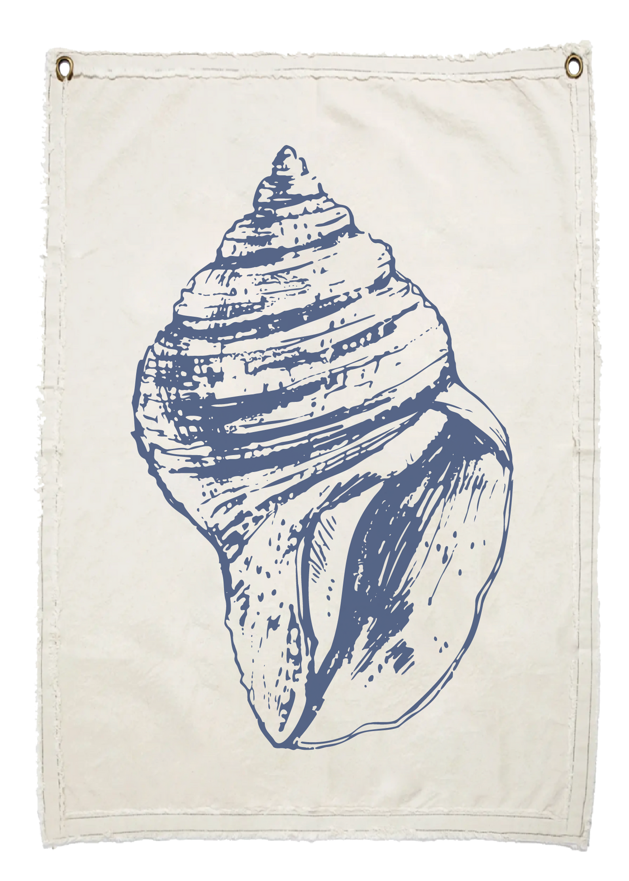 Lona color crudo impresa, bordes desflecados y ojetillos.